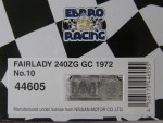 | Massstab | 1:43 |  durchsichtige Scheiben, schwarzes Renninterieur und Heckblende. Aufgesetzter Heckspoiler, Kotflügelverbreiterungen, Scheinwerferabdeckungen und Frontstossstange in Wagenfarbe, hinten nicht montiert. In silber eingefärbte Scheibenrahmen. Rot-weiss-blaue 3-Farbenlackierung mit der schwarzen Startnummer 10 auf den Seiten und der Motorhaube und diversen Werbeaufdrucken. Kolorierte Rückleuchten. Silber-graue 4-Steg-Felgen mit Gummi-Reifen. Rennfahrzeug aus der SCCN-Meisterschaft von 1972 des Fahrers H. Yanagida des GC-Mobile Renn-Teams. Fahrzeug aus der Die-Cast Racing-Serie