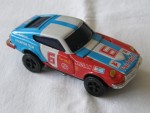| Massstab | 1:43 |  blaue, nicht durchsichtige Scheiben. Chromkühlergrill-Stossstangen-Heckleuchteneinheit vorne und hinten. Auf der blau-weissen Motorhaube die Aufdrucke "Fairlady Z" und die rote Startnummer 6. Auf den Seiten die weiss-rot-gelben Aufdrucke "Nissan Fairlady Z" sowie die Startnummer 6 und Werbeaufdrucken. Blechmodellauto mit groben Details, mit kolorierten Scheinwerfern. Schwarze 5-Steg-Felgen mit Hartplastikräder und Schwungradantrieb