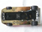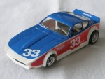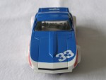 durchsichtige Scheiben, ohne Interieur. Aufgesetzter Heck- und Frontspoiler und Kotflügelverbreiterungen in Wagenfarbe. Einem Rennfahrzeug des Bob-Sharp-Racing-Teams mit der legendären Startnummer 33 nachempfunden. Kolorierte Rücklichter. Alu-Tiefbettfelgen mit Weichgummi-Reifen. Fahrzeug für die Schlitzrennbahn komplett mit Chassis und Motor |