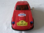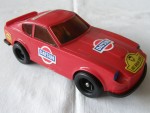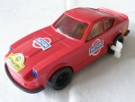 orange, nicht durchsichtige Scheiben. Schwarze Stossstangen. Diverse Werbeaufkleber wie "Datsun, Dunlop und East-African-Safari". Blaue Lichter. Schwarze 5-Steg-Felgen mit Hartplastikräder und mit Aufzugs-Motor auf der linken Seite geführt. Sehr einfaches Kinderspielzeug und Feriensouvenier aus Griechenland |