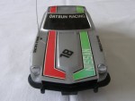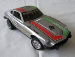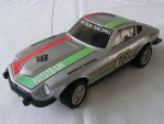 | Massstab | 1:17 |  schwarze, nicht durchsichtige Scheiben und Stossstangen. Auf der Motorhaube, dem Dach und den Seiten grün-rote Streifen-Aufkleber mit dem Aufdruck "Nissan". Zusätzlich zwei schwarze Aufkleber mit dem Aufdruck "World Racing" und der Startnummer 18. Auf den Seiten zusätzlich ein weiss-schwarzer Aufkleber mit der Startnummer 18. Auf der Heckklappe ein schwarz-weissen Kleber mit dem Aufdruck "Fairlady 240 Z". Vor der A-Säule rechts die Funkantenne für den batteriebetriebenen Fahrbetrieb. Chrom Lichter und 5-Loch-Felgen mit Profilgummi-Reifen und lenkbare Vorderräder