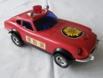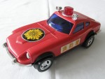 | Massstab | 1:16 |  blaue, nicht durchsichtige Scheiben und schwarze Kotflügelverbreiterungen. Heck-Jalousie in Wagenfarbe. Chrom Stossstangen, Scheinwerfer, Heckblende und Sirenen auf dem Dach. Auf der Motorhaube ein gelb-schwarzer Aufkleber als Hoheitszeichen des Feuerwehr-Einsatzleiters der Japanischen Feuerwehr, mit rotem Drehlicht auf dem Dach. Auf den Seiten und der Heckklappe weiss-gelbe, Japanische Zeichen. Kolorierte Rücklichter. Kunststoffauto mit batteriebetriebenem Anstossmotor. Chrom-4-Steg-Felgen mit Hartplastikräder