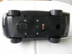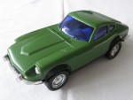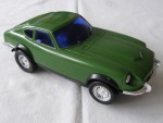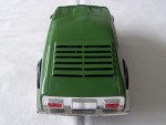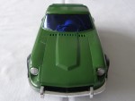blaue, nicht durchsichtige Scheiben und schwarze Kotflügelverbreiterungen. Heck-Jalousie in Wagenfarbe. Chrom Stossstangen, Scheinwerfer und Heckblende. Kolorierte Rücklichter. Kunststoffauto mit batteriebetriebenem Anstossmotor. Chrom-12-Steg-Felgen mit Hartplastikräder |