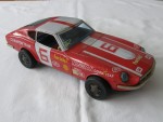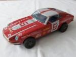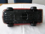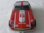 | Massstab | 1:14 |  durchsichtige Scheiben, farbiges Interieur mit weissem Steuerrad. Fahrzeug wird im Weissblech-Pressverfahren in mehreren Teilen geformt und mittels Lithographie bedruckt, ein Schwungrad-Antrieb verbaut und zusammengestellt. Farblose Blech Stossstangen-Kühlergitter-Einheit und Heckblende-Leuchten-Einheit. Einem Rennfahrzeug nachempfunden, mit roter Startnummer 6 und diversen Werbeaufdrucken. Blaue Plastik-Scheinwerfer. Graue 5-Steg-Felgen mit Hartplastikräder. Fahrzeug älterer Prägung