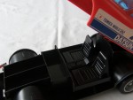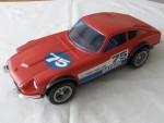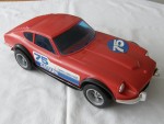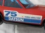 | Massstab | 1:10 |  bläuliche Scheiben mit schwarzem Interieur Kotflügelverbreiterungen und schwarzer Gummischlaufe als Tragriemen. Heckjalousie in Wagenfarbe. Chrom Stossstange (vorne defekt) und hinten als Stossstange-Heckblenden-Einheit und Scheinwerfer. auf der Motorhaube die blau-weisse Startnummer 75. Auf den Seiten ein blau-weisser Aufkleber mit dem Aufdruck "75 Datsun Tomica-World". Kunststofffahrzeug als Kinderpielzeug und Aufbewahrungswagen. Die Karosserie kann aufgeklappt werden und darunter können Tomica-Modellautos aufbewahrt werden. Graue 5-Steg-Felgen mit Hartplastikräder