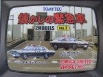 | Massstab | 1:64 |  durchsichtige Scheiben, schwarzes Interieur, Kühlergrill und Heckblende. Silberne Scheibenrahmen, angedeutete Scheibenwischer, Türgriffe und Embleme. Chrom Stossstangen. Rechtslenker Einsatzfahrzeug der Japanischen Polizei mit roter Lichterbar auf dem Dach und Hoheitszeichen auf den Seiten und der Heckklappe. Kolorierte Lichter. Dunkelgraue Originalraddeckel mit Profilgummi-Reifen. Fahrzeug aus dem Sonder-Polizei-Set, zusammen mit einem Nissan Cedric Sedan (nicht mehr vorhanden) und einer Polizisten-Figur in Spezialverpackung