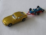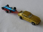 | Massstab | 1:60 |  durchsichtige Scheiben, hellgelbes Interieur und zu öffnende Türen. Linkslenker Fahrzeug für den USA- und Europa-Markt. Auf der Motorhaube orange-rote Wellenstreifen. Bodenplatte ist auch gleichzeitig die Stossstangen- Kühlergrill- Rückleuchteneinheit, mit Schlepphaken ohne Plastik-Aushängschutz. Chrom-3-Steg-Felgen mit Hartplastikräder. Original-Gespannkombination mit 1-achsigem Anhänger samt blauem Formel-Rennwagen mit der weiss-blauen Nr. 4